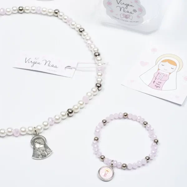 Este hermoso kit incluye un collar y una pulsera de vidrios y perlas, ambos tienen hermosos dijes de la Virgen Niña. Además incluye un sticker único para poder pegar donde deseen