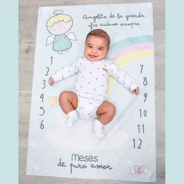 Manta de trucker con diseño para sacar fotos mes a mes del bebé. La pensamos que sea horizontal para que acompañe el formato de las fotos que más que nada tomamos con el celular. Incluye flechita de madera para marcar el mes.