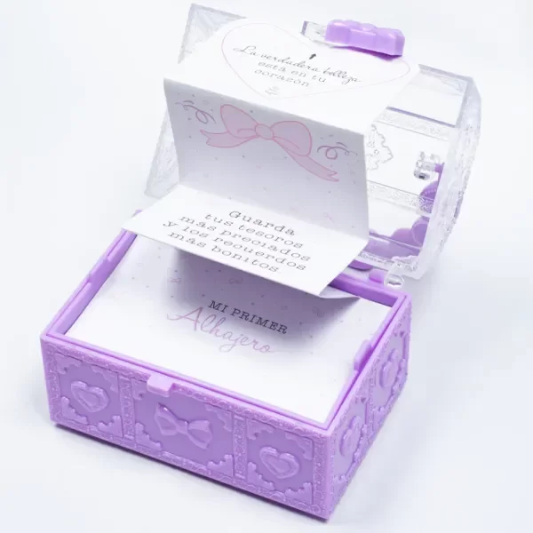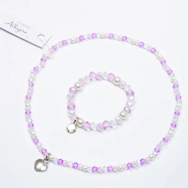 Exclusivo y encantador alhajero para guardar los tesoros más preciados y los recuerdos más bonitos 💜. ¡Pero eso no es todo! Dentro incluye un collar y una pulsera elastizados, hechos con sofisticados cristales lilas y perlas.