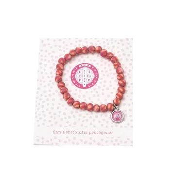 Pulsera de cuentas mini siliconadas pensada para niños y niñas desde los 6 o 7 años en adelante. Tiene una medalla mini de 1 cm. de diámetro con la imagen de San Benito versión tierna. Disponible en turquesa y fucsia.