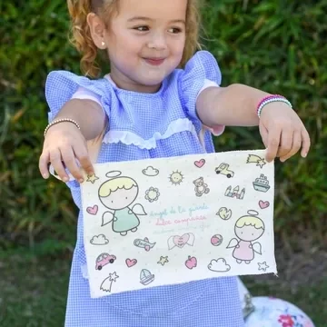 Toalla de mano sublimada con la imagen del angelito de la guarda y la oración: “Ángel de la guarda, dulce compañía, cuídame mucho xfis”. Apta lavarropas, medida: 29x19 cm. Trae cinta para colgar.