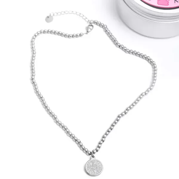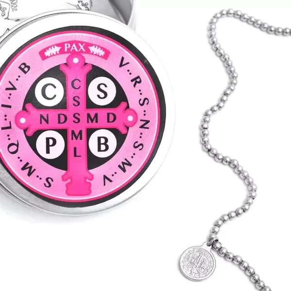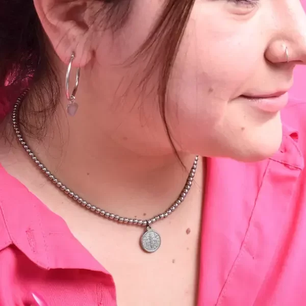 Collar de acero quirúrgico con cadena y bolitas enhebradas y un dije pequeño de San Benito. Es un modelo súper trendy y canchero. Además viene presentado en una lata con la tapa de San Benito en color fucsia, perfecto para regalo🎁.