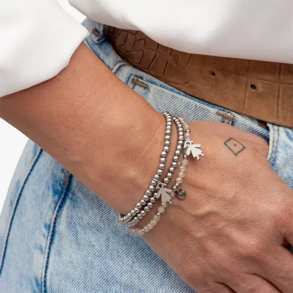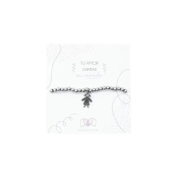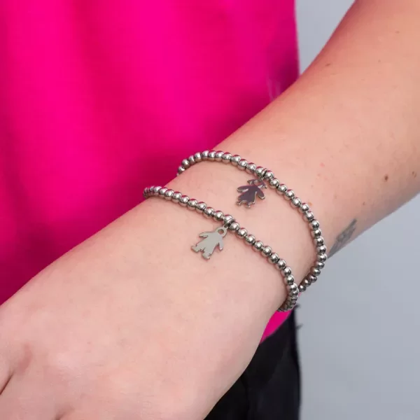 Pulsera elastizada con bolitas de acero y dije de nene o nena. Viene presentado en bolsita de gasa. Es el regalo perfecto 🎁.