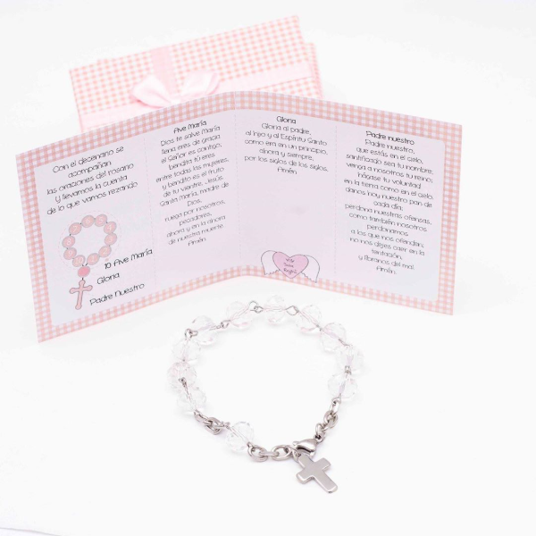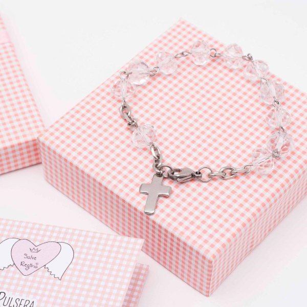 Pulsera de cuentas de cristal y acero quirúrgico. Es un decenario que finaliza con cruz de acero. Incluye una tarjeta que te enseña como rezar un decenario. Es ideal para una novia, o para regalo de Comunión de una nena. Es muy delicada, hermosa y clásica. Perfecta para usar como básico todos los días.