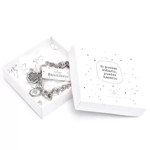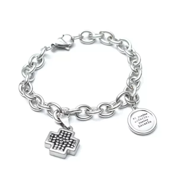 Pulsera de cadena de acero con dijes de cruz del Equilibrio y medalla con frase.
