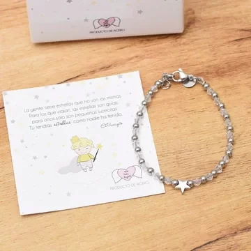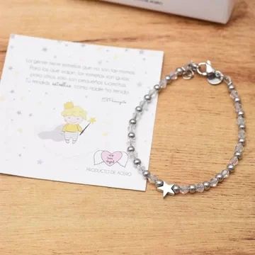 Pulsera de cristales pequeños tipo Swarovski con cuentas de acero y una mini estrella. Mide aproximadamente 18 cm y tiene cadena extra para agrandarla. Es una pulsera inspirada en El Principito, viene con caja con la frase: Tendrás estrella como nadie ha tenido.