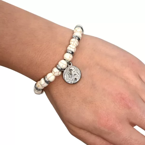 Pulsera elastizada de cuentas de piedra Howlitah con un dije de San Benito de acero, súper delicado.