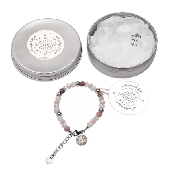 Pulsera de tanza de acero con cuentas de vidrio en tonos blancos y rosados, acompañada de piedra natural jaspe rosa 🌸, asociada con la protección, el amor y la compasión. Incluye dije de San Benito para sentirse cuidada en todo momento. Su presentación en lata reutilizable con sticker la convierte en un regalo con mucho significado, pensado para acompañar cada día.