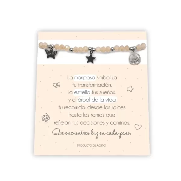 Pulsera elastizada con cristales en tonos nude, un diseño delicado y lleno de significado. Tiene tres dijes especiales: una mariposa, símbolo de transformación; una estrella, que representa los sueños; y un árbol de la vida, que marca el recorrido. Viene con una hermosa tarjeta que explica el significado de cada uno, convirtiéndola en el regalo perfecto para alguien a quien le desees solo cosas buenas. ✨