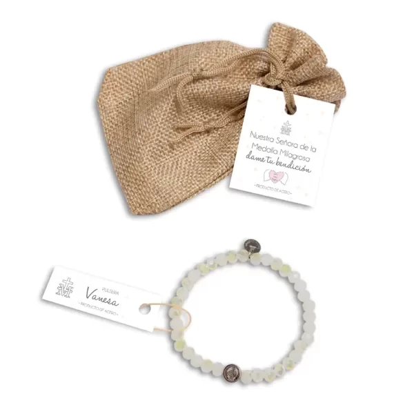 Pulsera elastizada de cristales nácar con dije de la Medalla Milagrosa en acero quirúrgico ✨. Su diseño versátil y atemporal fue pensado para llevarla a diario y sentirse siempre bendecida. Viene presentada en una bolsita de arpillera, lista para regalar.