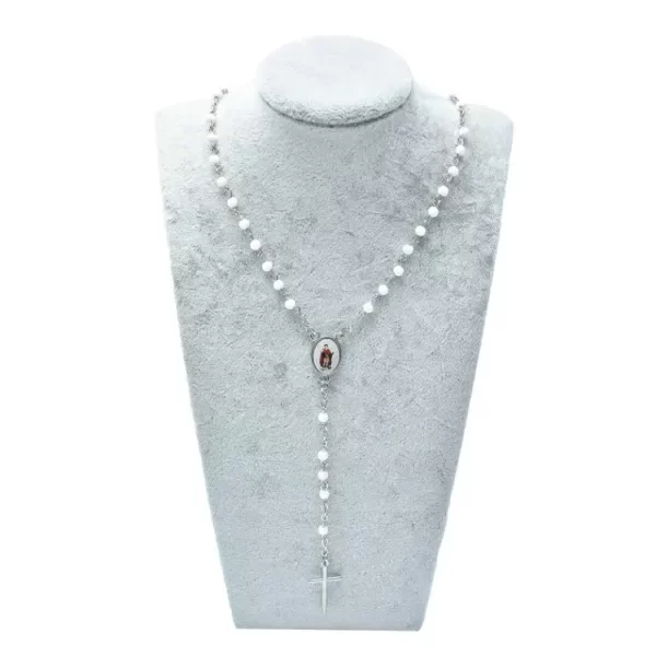 Rosario de cuentas de acrílico, centro resinado con imagen tradicional y cruz de aleación de metales.