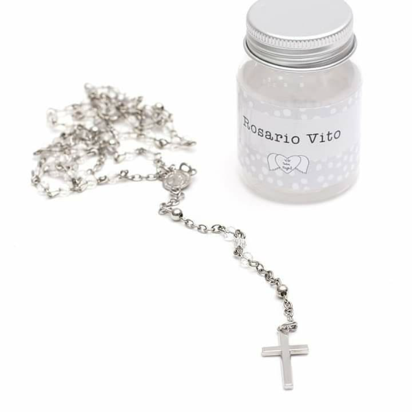 Rosario de aleación de metales y cristales de acrílico con centro de San Benito y cruz simple, presentado en un frasquito. Ideal para rosario de comunión o como para regalar en esta ocasión tal linda.
